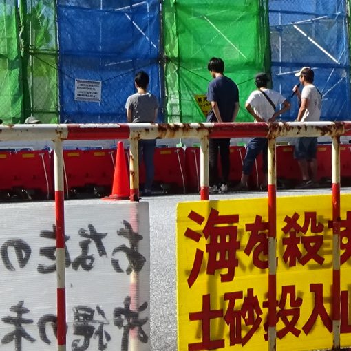 10人ほどで入り口前でデモ行進しながら、土砂を運び込むダンプの運転手に向かい、「海を壊すな」「サンゴを潰すな」などと声を上げ抗議行動を続けた。道行く車両にも手を振ってアピール。土砂搬入は終日続けられ、計623台のダンプが桟橋内に土砂を運び入れた。運搬船3隻が大浦湾に向け出港した。