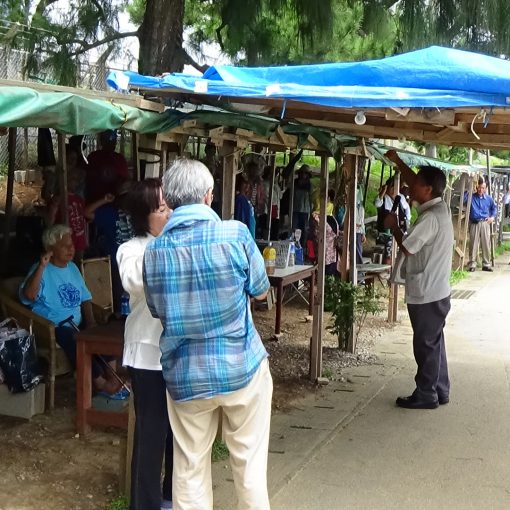 隣町に住む比嘉良子さん(74歳)は毎日のように夫に手を引かれゲート前にやってくる。2歳の時にはしかによる高熱で光を失い、音と声だけを頼りに抗議の声を上げ続ける。「今、なにが起こっているかわかるよ」と言いながら、ミキサー車が通り過ぎる音に、すぐさま声を張り上げた。「海の生き物を殺すな、竜宮の神様が怒っているぞ、バチが当たるぞ」