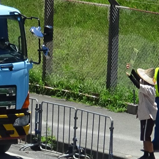 台風がまた近づいてきた。時々強雨が襲う中、約40人で抗議を続けた。台風対策のためか、資材搬入は午前中2回のみ(127台)で終了した。台風のおかげで?今週はこれで工事はなし。差し入れのスイカを頬張って「来週からまたがんばろう」とシュプレヒコールを上げ解散した。