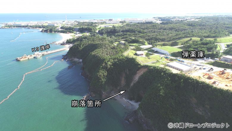 沖縄ドローンプロジェクトの調査でキャンプシュワブ内にある辺野古弾薬庫のすぐ近くでがけ崩れが発生していることが分かった。がけ崩れの規模は高さ30メートル、幅15メートルに及び、赤土が海に流れ出ているのが確認された。