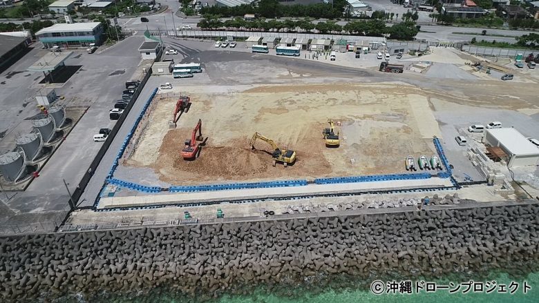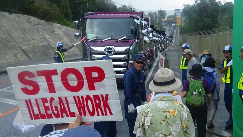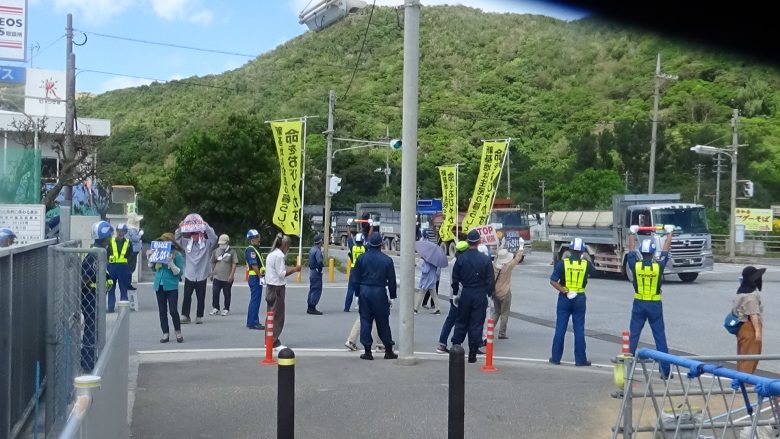 照りつける陽射しは相変わらず暑い。きょうも愚直に抗議を続けた。横浜や福岡などのグループ数十人が座り込みに参加し、機動隊にごぼう抜きされながらも抗議のシュプレヒコールを繰り返した。福岡から参加した人は「埋め立てている現場を見て涙が出てきた。人間も自然の一部であることを気付くべきだ」「思っていたより規模が大きい。投入される土砂が税金だと思うと悔しい」などと話していた。午前午後3回にわたり計170台が資材を積んで基地内に入った。