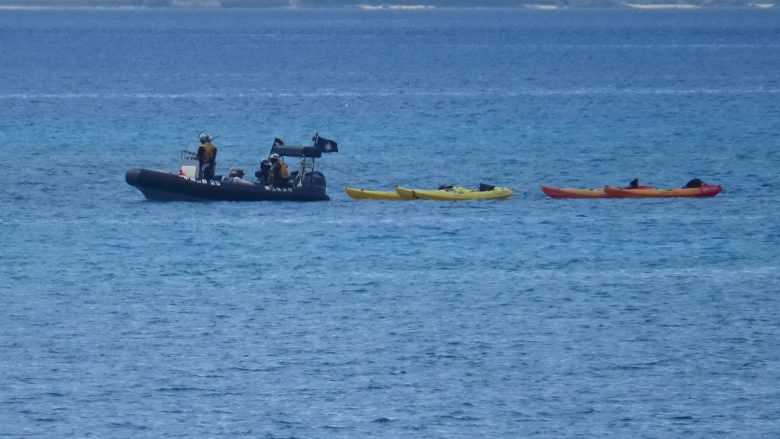 安和桟橋では海と陸で抗議行動を展開。カヌーチーム10艇は桟橋下に潜り込み、運搬船の出港を遅らせた。市民がガット台船から流出した赤土が海を真っ赤に染めている場面を発見。防衛局職員に抗議、対応を厳しく求めた。ベルトコンベアの故障もあって積み込みが遅れ、この日は運搬船2隻が401台分の土砂を積んで出港した。