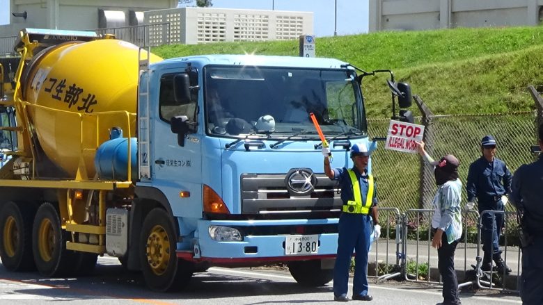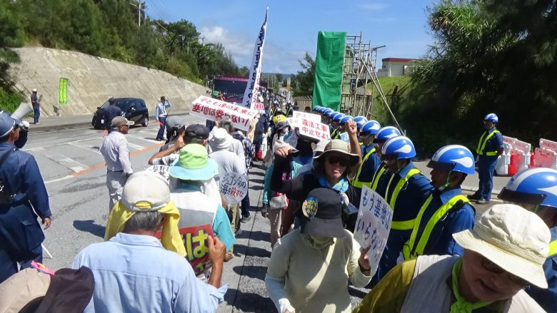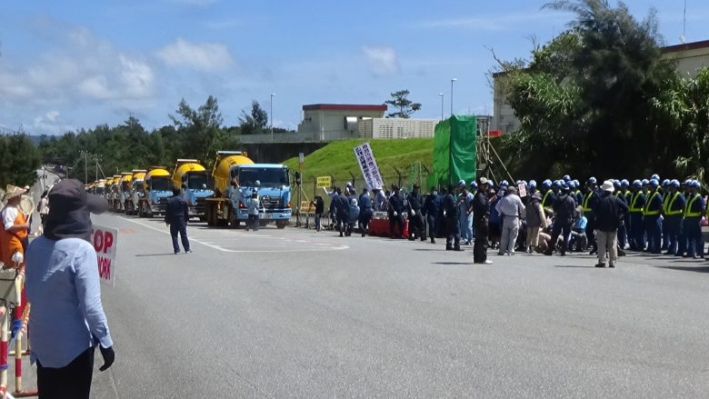 台風が過ぎ去って再び本格的な工事が始まると知ってか、朝から大勢の人が抗議に集まってきた。県外からの参加者が目立った。昼頃には150人に膨らみ、「違法工事をやめろ」「サンゴをつぶすな」などとシュプレヒコールを繰り返した。機動隊もいつもより多く出動し、座り込んだ市民を3,4人がかりで次々とごぼう抜きした。市民は排除され工事車両が入った後も、再びゲート前に集まり抗議のデモ行進を続けた。3回にわたり計154台の車両が基地内に入った。半分近くがテトラポット用の生コン車だ。
