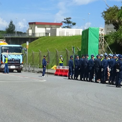 21日から5日間にわたって安和で土砂搬入阻止の大行動を行うことに対し、沖縄県警が一般車両が路上を何度も往復できないよう「Uターン禁止」の標識を設置していることが9日、わかった。安和桟橋前の道路1キロほどに数カ所設置していることが確認された。全国に参加を呼び掛けている21日からの大行動には、車両100台、抗議参加者500人以上が5日間にわたって結集すると予想される。車両100台が路上でダンプの出入りを抑制し、出入り口に数百人が抗議のデモをおこなえば、おそらく土砂搬入はほとんどできなくなる。Uターン禁止の標識は警察の対抗策のひとつだが、抗議する市民側もそれなりの対応策を考えているようだ。