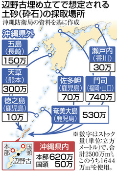 大浦湾埋め立てに使用される土砂が当初の計画では県内外21カ所で採取し、運搬することになっていたが、さらに41カ所で追加調査していることが情報公開請求で分かった。新基地建設の埋め立てには総土量約2500万立法メートルが必要とされ、そのうち県外からは1600万立方メートルが運ばれる予定(採取予定地は別紙の通り)。しかし、一部地域で採取禁止や総量規制があることから、沖縄防衛局は鹿児島県や長崎県、宮崎県なども調査対象に加えた。辺野古新基地への土砂搬出には各地域で「故郷の土砂を基地建設に使わせない」と大きな反対運動が起こっており、土砂採取の対象地が広がればさらに反対運動は西日本全体に拡散していくとみられる。