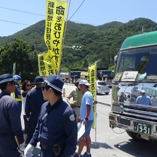 朝9時、約70人がゲート前に募った。得意の山城節がさく裂し、座り込む人々を励ました。歓声と口笛が飛び交った。その後も歌あり、踊りありでゲート前はわき立った。午後3時になっても60人以上が残り、抗議の声を上げ続けた。205台が資材を搬入した。