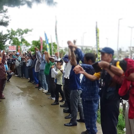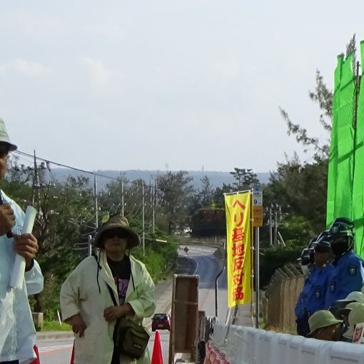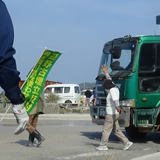 横殴りの風雨の中、約30人で抗議を続けた。スリップによる事故を恐れてかダンプは1台1台慎重に桟橋に入ろうとする。そのため常時40台以上が国道に渋滞した。こんな悪天候の時こそ、参加者はいつも以上に意地を出して頑張り続けるようだ。桟橋の入り口と出口で一日中プラカードを掲げて歩き、抗議の意志を示した。ダンプ508台分が運搬船に積み込まれ、2隻が大浦湾に向け出港した。