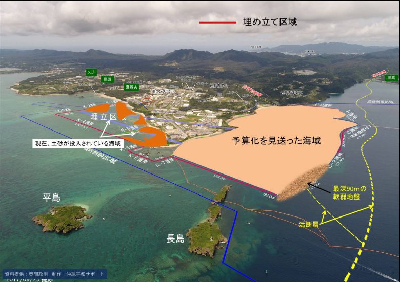 沖縄防衛局は2020年度の予算案で、大浦湾側に存在する軟弱地盤の改良工事の経費をまたも見送った。18年度、19年度に続き3年連続で、基地建設はさらに長期化を余儀なくされるもよう。