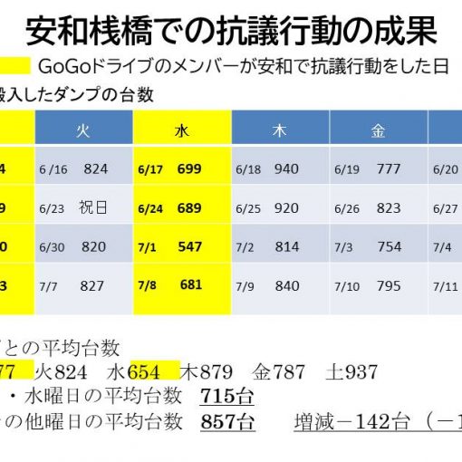 10人ほどの少人数で終日抗議。GoGoドライブのメンバー6台も加わり、ダンプの土砂搬入を遅らせた。国道には常時30台近いダンプが渋滞していたが、昨日のように両側から入れることはなかった。630台が土砂を運搬船に運び入れた。