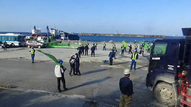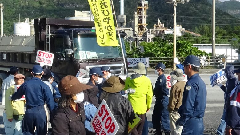 南部島ぐるみのメンバーら約40人が桟橋の入口と出口に分かれ抗議を続けた。GoGoドライブのメンバー8台も国道を往復してダンプが桟橋から出てくるのを抑えた。防衛局の職員なのか、抗議する市民に混じってスピーカーで「車両の邪魔をしないでください」と盛んに叫んでいる。防衛局職員が歩道に出て警察と同じように市民を規制する権限はないはずだ。明らかな越権行為。職員に抗議してもただただ無視を決め込んでいた。