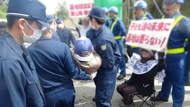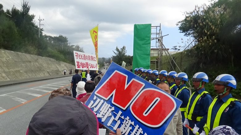 約35人が朝8時半から抗議の座り込み。女性たちが中心となって歌とスピーチでゲート前を明るくさせた。機動隊員も女性たちの語り掛け、説得、抗議を受けて、なかなかすぐに排除にかからない。自分の母親にでも説得されているような気持なのか、神妙な顔つきの隊員が多い。男性の罵声よりも女性の諭すような話しぶりが若い機動隊員には効き目があるようだ。それでも隊長の指揮のもと一斉に排除に取り掛かった。排除され車両が基地内に入った後も、参加者はデモ行進を繰り返した。