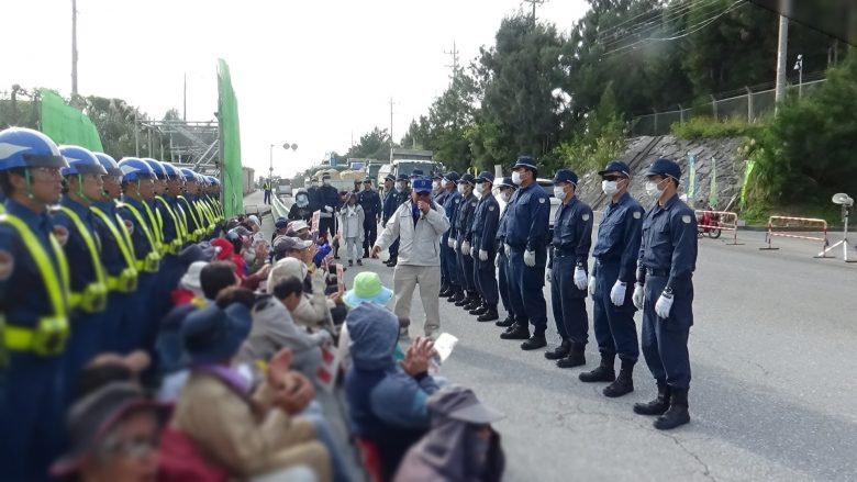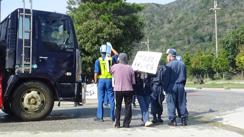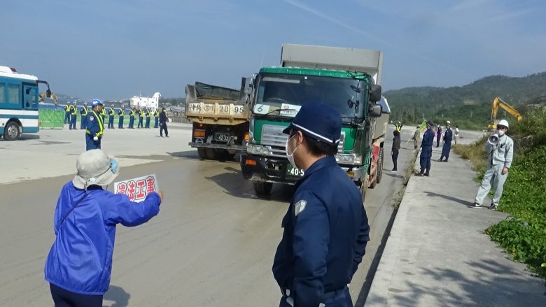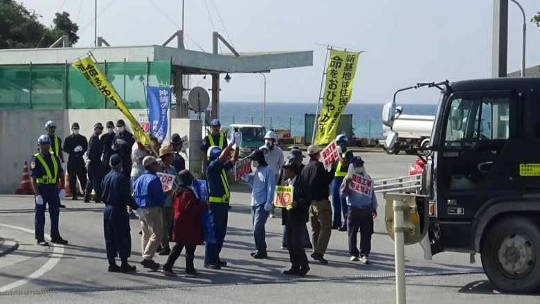 12時には同メンバーを含め100人近くがゲート前に座り込んで抗議した。午前午後3回にわたり、生コン車など180台が資材を搬入した。