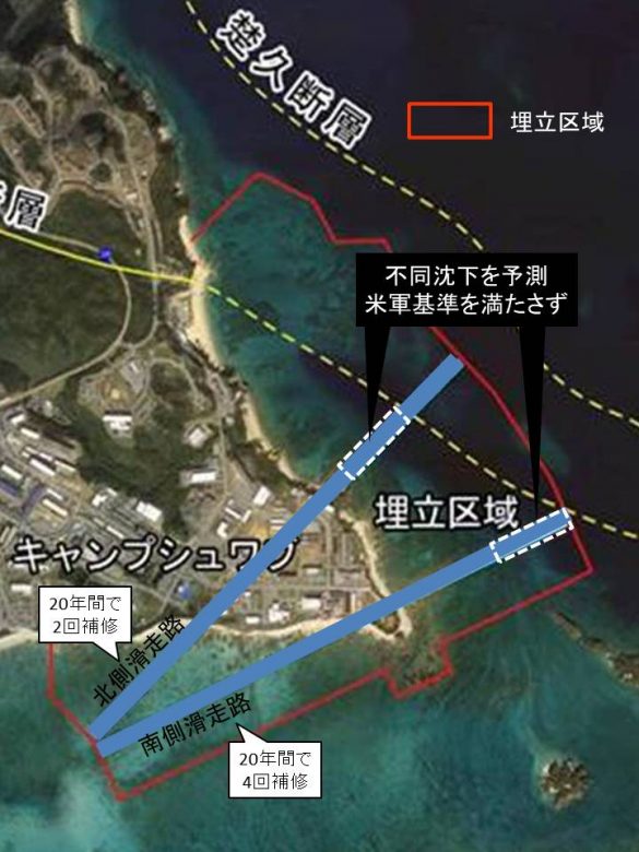 防衛省が進めようとしている新基地の地盤改良計画案が、米軍の求める滑走路の性能基準(UFC)を満たしていないことがわかった。国会での野党議員の追及で明らかとなった。UFCは滑走路の端から300m未満で「勾配の変化がない」と規定するが、新基地は2本の滑走路に不均等な地盤沈下が予測されている。建設予定の滑走路2本は使用後20年で北側が最大8センチ、南側が最大12センチの「不同沈下」(不ぞろいな沈み)が見込まれている。防衛省は「米国と協議の上、国際民間航空機関(ICAO)の基準を採用した」としているが、条件の甘い民間基準を採用したことに疑問と批判が声が高まっている。