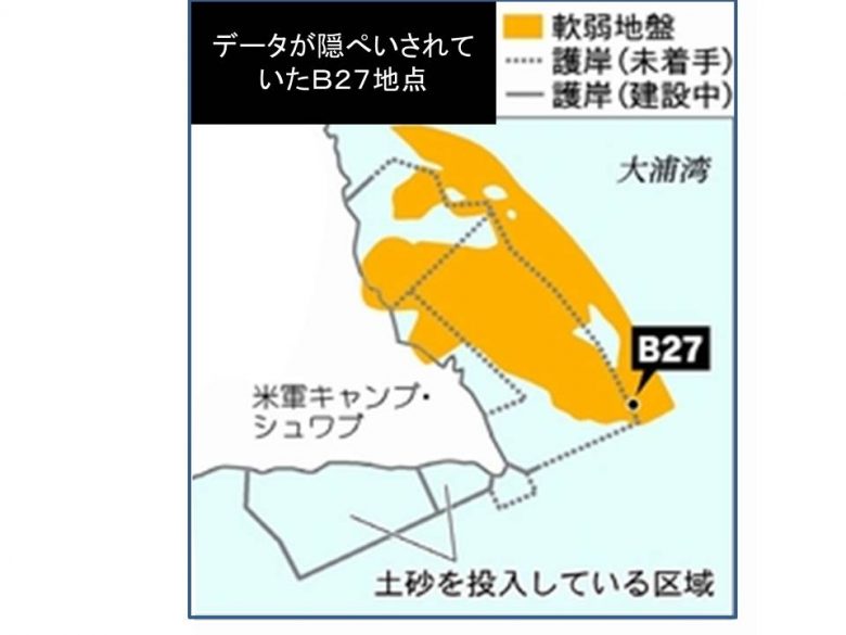 防衛省がまた、重要なデータを隠ぺいしていたことがわかった。大浦湾の地盤調査で水深70mより深い地層のデータがあるにもかかわらず、隠し通していたことが明らかとなった。防衛省は地盤改良工事にあたり、不都合なこのデータを設計変更に反映させず、他の地点のデータをもとに新基地の地盤の安定性を確保できると説明していた。今回明らかとなった業者の報告書によると、調査地点「B27」の水深70m~90mは「マヨネーズ並み」とも言われる強度。しかし防衛省が採用したデータは、「B27」地点より150~750mも離れた地点のものだった。