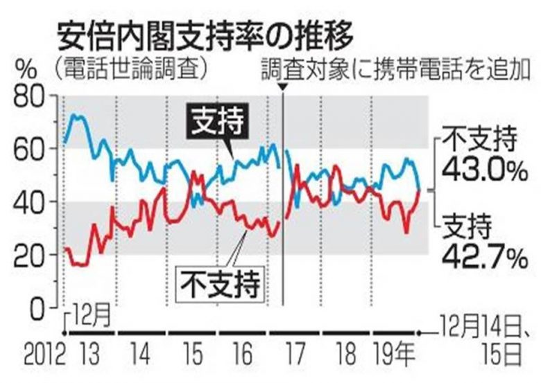 安倍内閣の支持率が急落した。共同通信社が15、16両日に実施した世論調査によると、安倍内閣の支持率は41.0%で前回調査の1月から8.3ポイント下落した。「桜を見る会」疑惑で、言い逃れや隠ぺいを続けている首相に対する国民の不信感が一気に高まった形だ。ちなみに「安倍首相の説明を信用できない」と答えた人は8割を超えた。安倍内閣不支持率は、前回から9.4ポイント増え46.1%へと逆転。いよいよ安倍首相が追いつめられている。