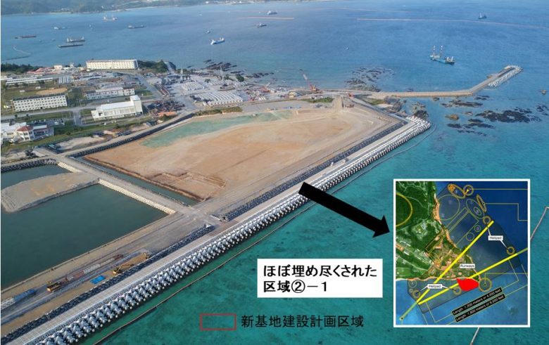 写真は27日、ドローンで撮影した埋め立て現場の状況。区域②-1がほとんど埋め尽くされた。(写真提供:沖縄ドローンプロジェクト)
