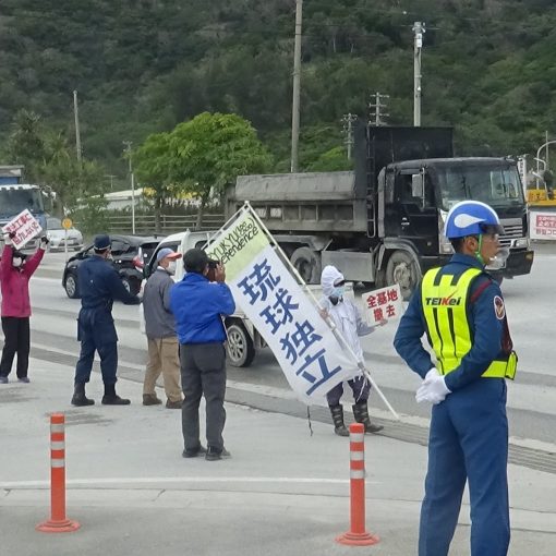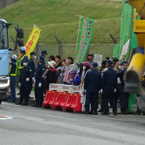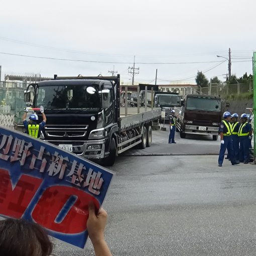 左折して搬入するダンプが朝から続いた。左折のダンプは市民を巻き込む危険があることから、山城博治さんら10人余りが座り込んで抗議したが、機動隊に排除された。その後も運転手に向かい激しく抗議するもののその度ごとに排除された。620台が土砂が採石場から搬入され、構内の土砂691台分が運搬船3隻に積み込まれた。