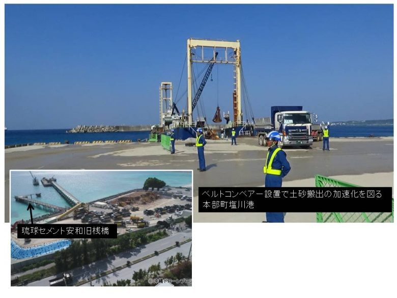土砂搬出の大幅な遅れから沖縄防衛局は、今年1月、塩川港でベルトコンベアー設置を沖縄県に申請した。土砂搬出の加速化を図ったものだ。その許可が下りる前の機材持ち込みは明らかな条例違反となる。