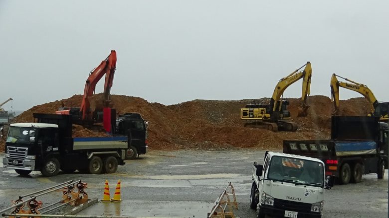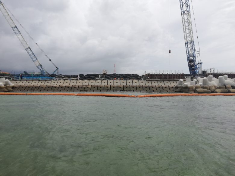その辺野古側の区画ですら、まだまだ先は長い。8日の政府側の国会答弁によると、投入した土砂は契約した5割に達したばかりという。半年としていた工期は、2018年12月の開始から1年半が過ぎても半分程度しか達していない。さらに滑走路の高さである海面9mまでかさ上げし整備しなければならない。共産党の赤嶺議員は「今のペースだと7年はかかる」と指摘した。