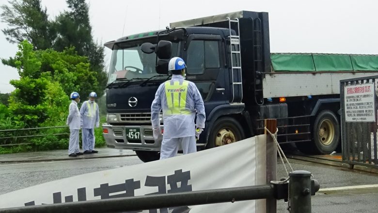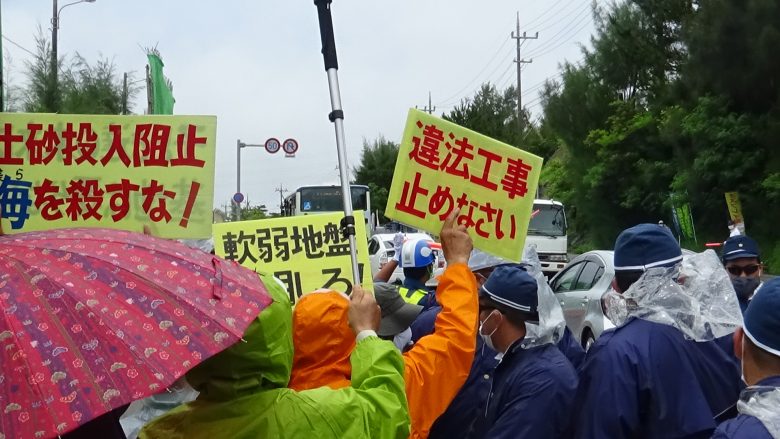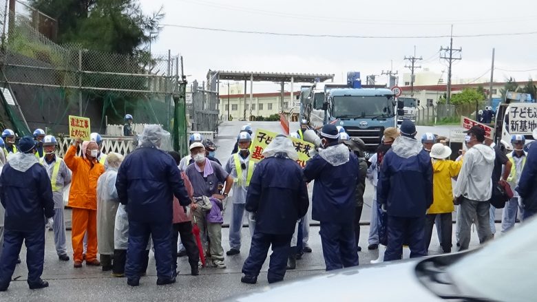 山城博治さんが現場責任者に理由を尋ねると、塩川で警備員が市民に体当たりして負傷させ訴訟になっている件をあげ、責任者は「ゲート前でも同様のことが起きた時の証拠として残すため」と説明。山城さんは「これではわれわれと警備員は敵対関係になってしまう。考え直すべきだ」と追及するが、本社(東京)の担当者が不在として、回答は来週に持ち越された。3回にわたり計57台が資材を搬入した。