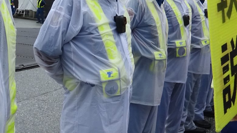 警備員の胸に小型カメラが装着されていることを参加者が発見し、大騒ぎとなった。「われわれを犯罪者扱いして撮影するのはおかしい。人権侵害だ」と激しく抗議。警備員は無言のまま立ち尽くし、警察に取り外すよう指示すべきだと食い下がるが、自分たちでは判断できないと傍観的な態度をとった。数十分にわたり現場は混乱した。警備員20人のうち8人の胸にカメラが装着されていた。