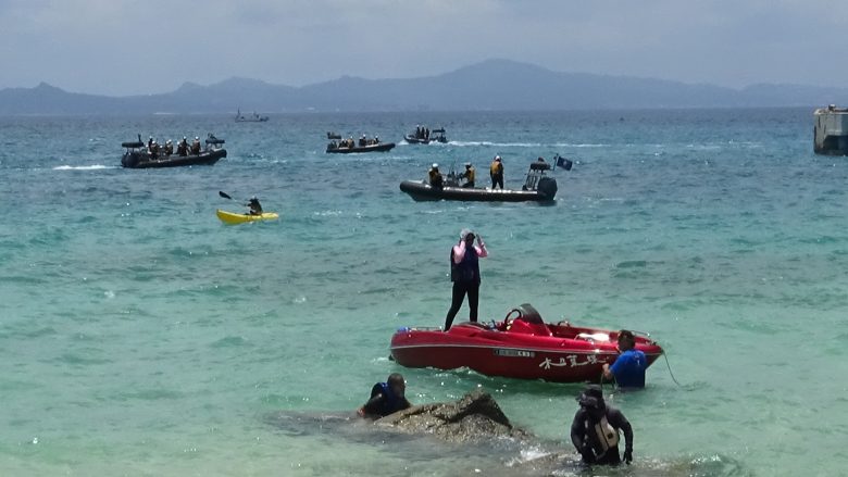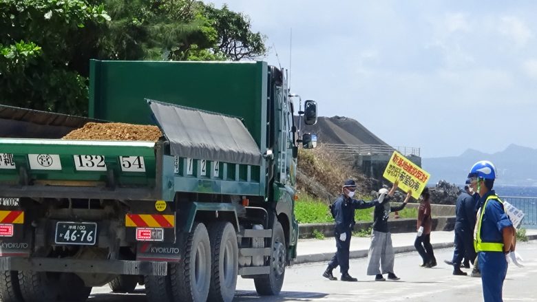 約20人が桟橋の出入口にわかれ抗議を続けた。GoGoドライブのメンバーも5台で加わりダンプの運行を遅らせた。海ではカヌー6艇、ゴムボート1艇が運搬船に張り付いて出港を1時間近く遅らせた。搬入作業は夜8時近くまで続き、運搬船3隻にダンプ903台分の土砂が積み込まれた。