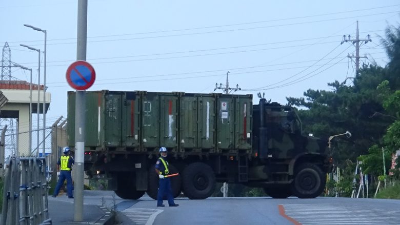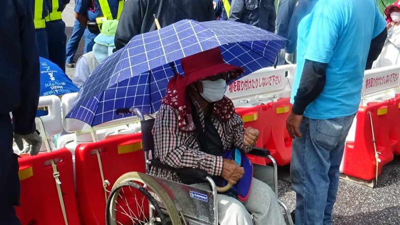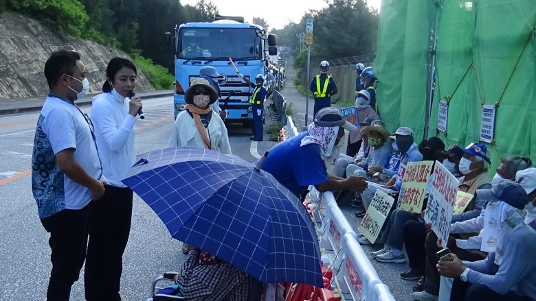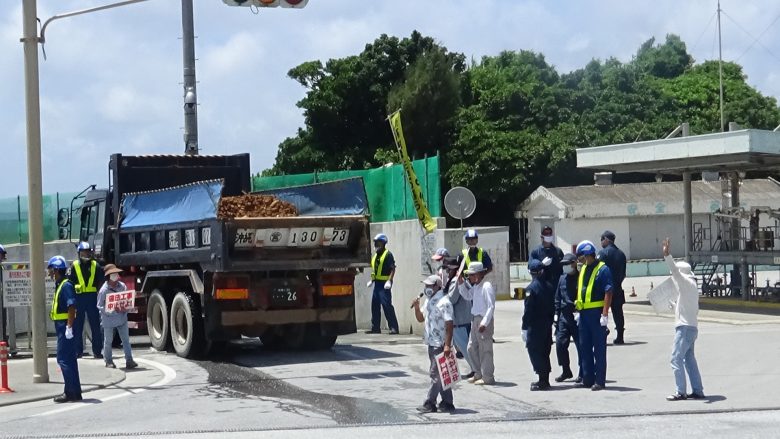 炎天下、94歳の島袋文子さんも加わり約65人が座り込んだ。久しぶりの大人数だ。機動隊の移動の説得を無視してできるだけ長く粘った。計261台が資材を搬入した。メインゲートからの米軍車両の出入りが目立った。