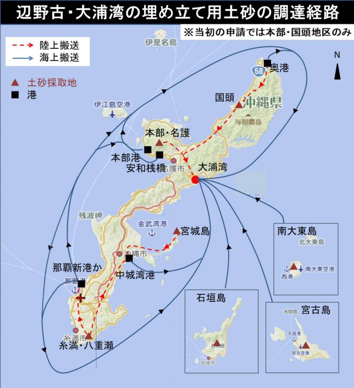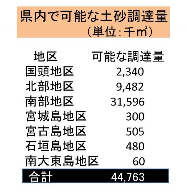 調達先は沖縄全島に広がり、石垣島や宮古島、南大東島まで含まれる。必要量2020万立法メートルに対し、調達可能量を約4500万立法メートルとしているのは今後、市民の抗議行動や地元採掘業者の請負い拒否などで難航することを予想し、調達先を柔軟にしているものと思われる。