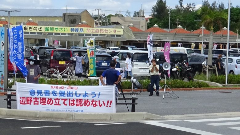 沖縄防衛局が県に提出した新基地建設工事の「設計変更申請書」に対する意見書募集が、しだいに熱をもって県内に伝わり始めた。オール沖縄では各団体にのぼり旗や横断幕を配布し、市民への宣伝活動を強めようと呼びかけている。ゲート前でも座り込みの有志たちで独自の提出用のハガキをはがきを作成し、山城博治さんを先頭に街頭宣伝を始めた。一昨日は宜野座(ぎのざ)道の駅の前で15人が道行く人にハガキを渡したり、車に向かい宣伝活動を行った。昨日、本日は名護市内5カ所で行った。沖縄県で募集した意見書のこれまでの最多は約3000。山城博治さんは「大きなチャンスがやってきた。知事が不承認とすれば、工事は止まる。ぜひ、これまでの2倍3倍の数を集めて玉城デニー知事の不承認決定の後押しをしよう」と市民に呼びかけた。
