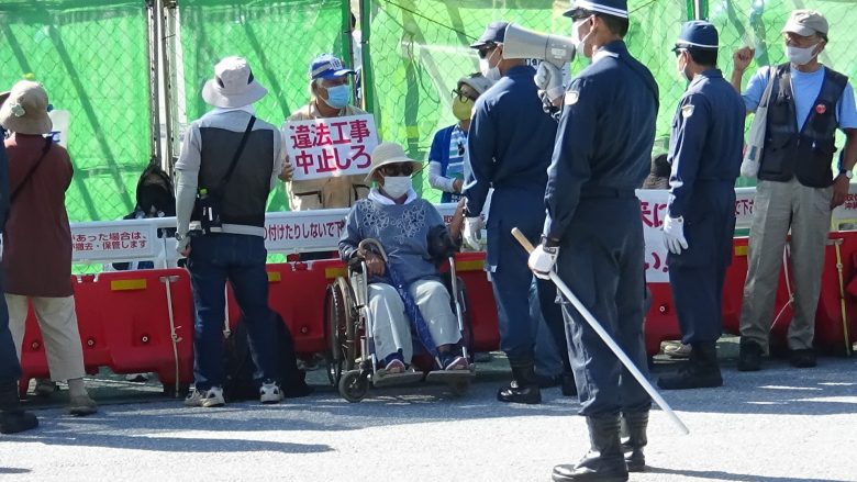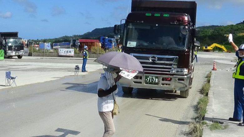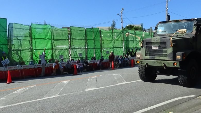 まだ本土からの参加者はほとんどいない。県内の40人余りで座り込んだ。米軍の大型車両が目の前を通過するたびにあちこちから怒号が飛んだ。この日のリーダー高里鈴代(たかさとすずよ)さんが、「防衛局の設計変更申請書に対する意見書をたくさん集め、玉城デニー知事の不承認決定を後押ししよう」と呼びかけた。