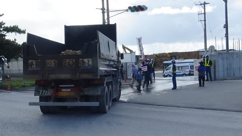 約30人が桟橋の出入口にわかれ抗議を続ける。出口ではダンプを出させるため10分以上も通行を封じたため、市民から機動隊長に向かい「道路交通法に従い、なぜ歩行者を優先させない。明らかに法律違反ではないか」など激しい抗議が飛び交った。それが何度も繰り返された。海ではカヌーチームが11艇で運搬船に張り付き、出港を1時間以上遅らせた。運搬船への積み込みは午後2時ごろに終了したが、採石場からダンプ841台分の土砂が仮置き場に運び込まれた。作業は夜8時近くまで続いた。