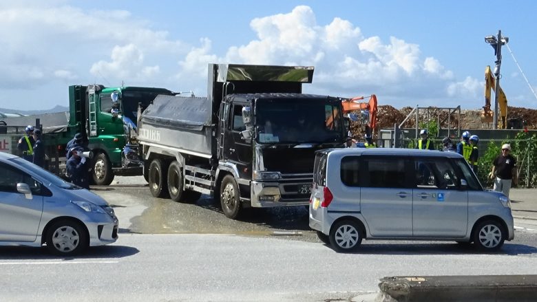 30度近い暑さの中、本部町島ぐるみのメンバー5人で抗議。道路を何度も横断してダンプの運行を遅らせた。522台分の土砂が台船に積み込まれた。