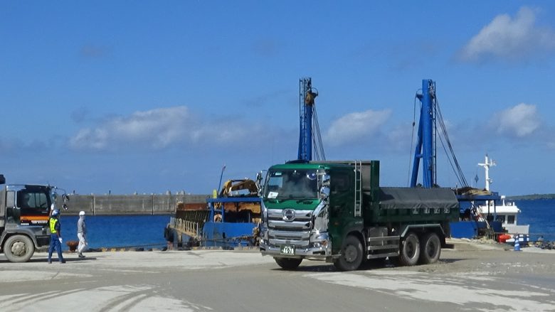 本部町のメンバー数人のみで抗議を続けた。それでも民間警備員や防衛局職員ら80人余りがいつもの配置についてダンプの誘導や警備にあたっている。構内を制服姿だけが動き回る。かなり異様な風景だ。港の一角では釣り糸を垂れる人が数人。土砂搬出作業がなければ、地元の人にとってはのんびりくつろげる場所であったに違いない。今後10年以上この光景が続くとなれば、本部町の憩いの場所はひとつ失われる。ダンプ504台分の土砂が台船に積み込まれた。