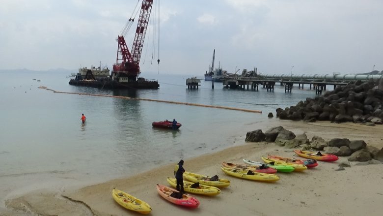 海ではカヌーメンバー10艇が運搬船の周囲に張り付いて1時間以上、出港を遅らせた。午後2時半ごろからベルトコンベアーの故障なのか、1時間半近く積み込み作業が中断した。旧桟橋近くには一昨日から大型の工事台船が停泊している。県との約束事である老朽化した旧桟橋の年内撤去が始まるもようだ。