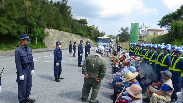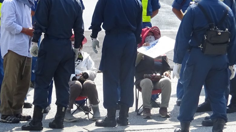 那覇島ぐるみのメンバーら総勢約40人が抗議の座り込み。この日のリーダー、瀬長和男さんがコロナ対策として参加者に機動隊員との不要な接触を避け、ある程度抵抗したのちに自主的に移動するよう説明した。機動隊もそれを承知の上、説得行動に入った。なかには粘り強く抵抗する人もいるが、10分余りで全員が移動しゲートが開けられた。