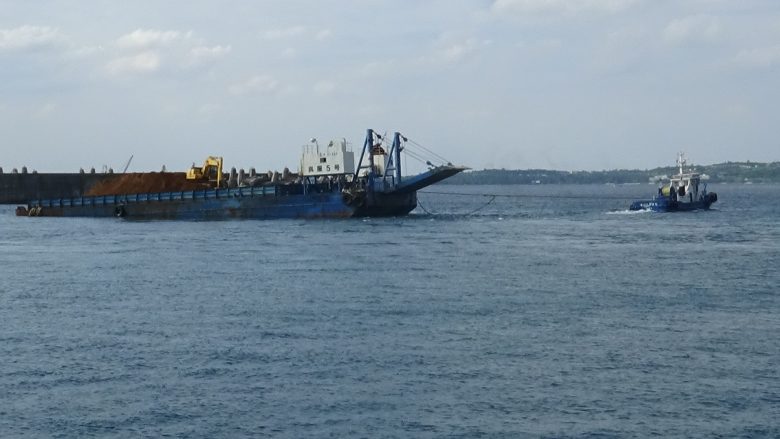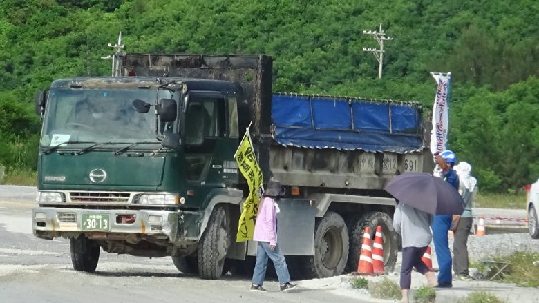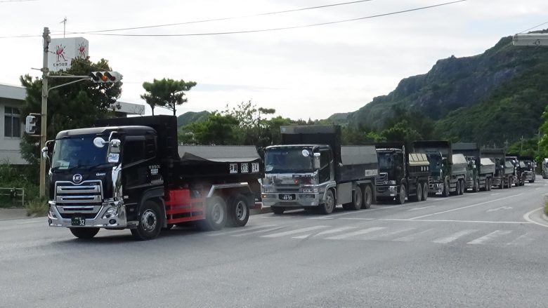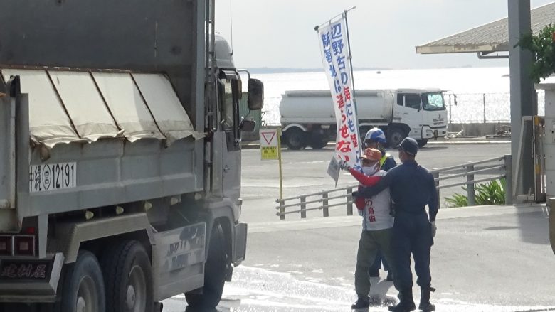 朝7時半から本部島ぐるみのメンバーら10人でダンプの前をゆっくり横切るなどして抗議を続けた。規制する機動隊員がいないため、9時過ぎにはダンプ約30台が渋滞する事態となった。安和からすぐに機動隊がやってきた。構内の監視カメラで逐次状況が伝わっているのだろう。安和、塩川両方の規制を担う機動隊員も忙しい。夕方5時までに台船4隻に489分の土砂が積み込まれた。