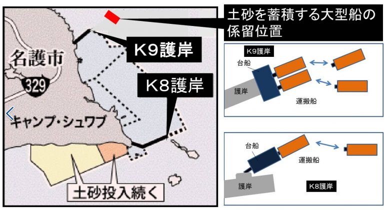 これまでの運搬船1隻ずつを護岸に付けて陸揚げする方法を改め、護岸先端に大型の台船(長さ60m、幅20m)を設置し、運搬船を台船に係留する方式にしようとするもの。これによりK9護岸では2隻同時の陸揚げ作業が可能となる。もうひとつのK8護岸はこれまでと変わらない1隻すつの接岸だが、より大きな船が係留できることになる。さらに大浦湾内に土砂蓄積のための大型船(長さ141m、幅36m)を常時係留することも検討し始めた。この陸揚げ方式の変更で大気汚染物質の排出量は増加するが、「環境監視等委員会」は問題なしとして検討を急いでいる。