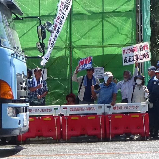 午後、小雨が降り続く中、告別式から戻った人たちを含め約40人が座り込んで抗議の意志を示した。3回の資材搬入で計230台が基地内に入った。