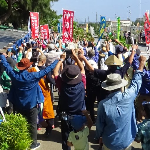 那覇の県庁前で玉城デニー知事を支える集会が12時から開催された。沖縄防衛局が県に提出した設計変更申請を不承認にするようオール沖縄会議が主催で呼びかけたもの。国会議員3名のほかオール沖縄の県会議員など250人が集まった。稲嶺進前名護市長や北上田毅さんが、渡具知名護市長が名護市民の意見を無視して「県に出すわずか3行の意見書で、埋め立てを承認しようとしている」と厳しく非難。国会議員からは「寄せられた1万7857通の意見書はほとんど設計変更を不承認と願うもの。特に名護市の579通はすべて不承認」と述べ。知事は自信をもって不承認の判断を下すようにと力を込めた。その後、決議したアピール文を玉城デニー知事に手渡した。