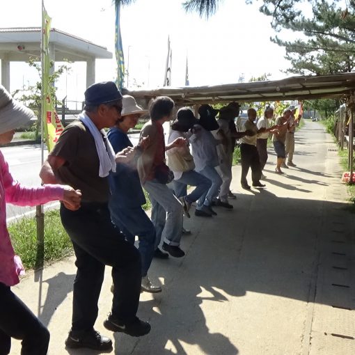 本部島ぐるみのメンバー6人だけの抗議。警察官も機動隊もいない。冷たい海風が吹く中、午後4時過ぎまで車道をゆっくり横断するなどしてダンプの運行を遅らせた。