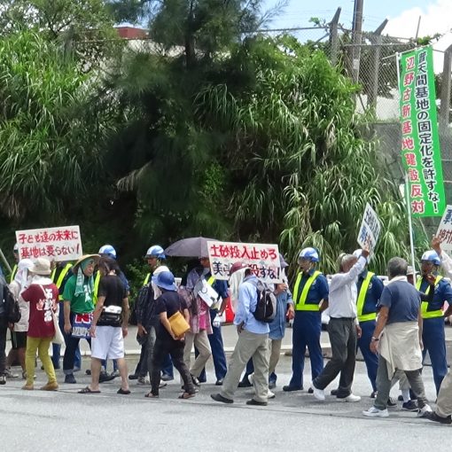 沖縄平和市民連絡会のメンバーら約50人が抗議の座り込み。機動隊が現れても歌を歌い続けた。