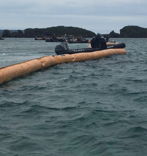 運搬船3隻に687台分の土砂が積まれ、大浦湾に向け出港した。