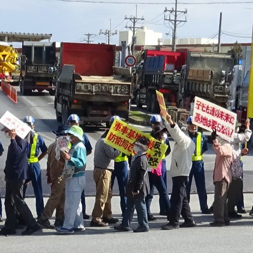 南部島ぐるみのメンバーら約20人が出入口に分かれて抗議を続けた。土砂を積んだ採石場からのダンプが常時国道を連ねた。ダンプの搬入を少しでも遅らせようと市民らはゲート前をゆっくり歩くなどしてダンプが連なって入るのを阻止した。海上チーム“辺野古ぶるー”が1か月半ぶりに、カヌー8艇、ゴムボート2艇で抗議に出た。1隻目の運搬船の出港を1時間半以上遅らせた。GoGoドライブのメンバーも3台でダンプが思い通りにゲートから出られないよう国道を動き回った。