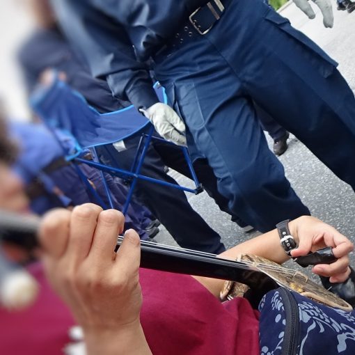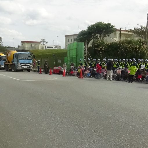 아침 8시 반부터 60여 명이 게이트앞에서 연좌 시위. 이날 집회 사회자인 나카모토 코신 씨가 게이트안에 대기하는 기동대원들에게 호소했다. “시민들을 배제하는 당신들은 마음 속으로는 이런 일을 하고 싶지 않을 것이다. 공무원으로서 법을 지키는 일을 하는 게 당신들의 진정한 모습이기 때문이다. 그러나 이 신기지 건설은 명백히 법을 어기고 있다. 그 것을 잘 생각하고 업무를 하시길 바란다.” 하지만 10분 후에는 평소대로 기동대가 나와서 제압이 시작되었다. 오키나와 협동 병원 직원 10명이 그 상황을 보고 있었다. 그 중의 한 남자직원이 “처음으로 여기로 왔다. 상상했던 것과 달랐다. 역시 현장에 와보니까 잘 알게 되었다.”고 말했다. 오전 오후, 세 번에 걸쳐 총345대의 차량이 자재를 반입했다.
