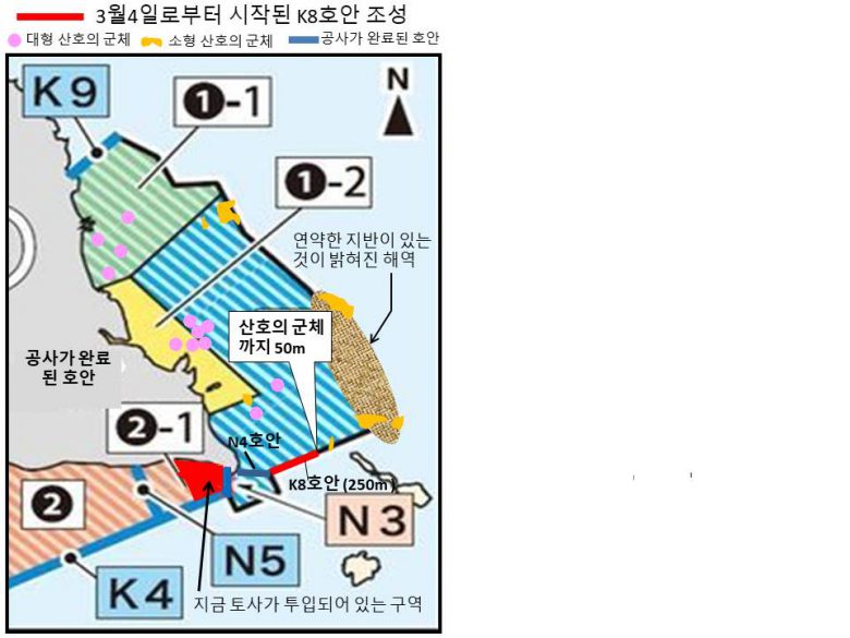 항의선2척과 카누5대로 바다에 나갔다. K8호안을 조성하기 위해 석재의 투입이 시작되었다. 게이트에서 들어온 덤프트럭으로 석재를 잇다라 떨어뜨려, 바다에 깔아진 석재를 포크레인으로 굳히 누르는 소리가 쾅쾅 울려퍼져 있다. 이 호안 조성 구역 바로 앞에 소형 산호 군락이 있는 것이 확인되어 있다. 이식 대상의 산호 군락이지만 방위국은 “공사는 호안의 일부까지만 할 예정이니 산호에 미치는 영향이 없다”고 하면서 공사를 시작했다. 전문가들은 K8호안 조성으로 오우라만의 바닷물 흐름이 변해지고 해역 전체에 환경 악화가 진행될 것이라고 지적하고 있다.