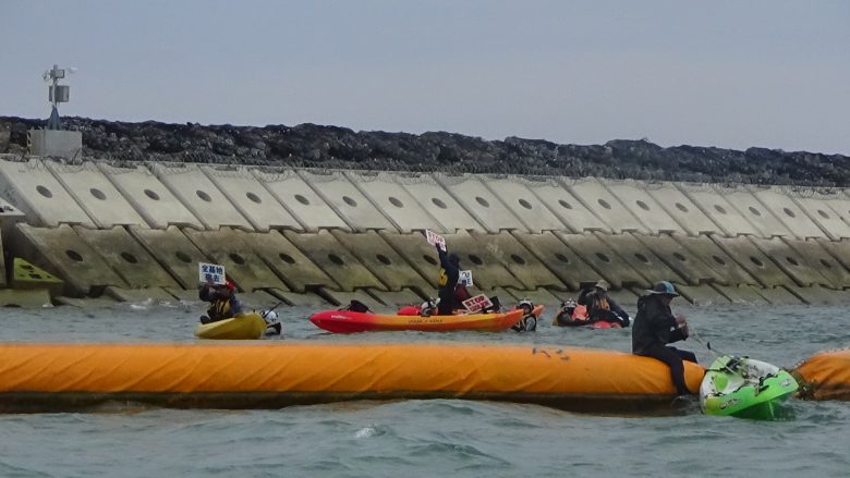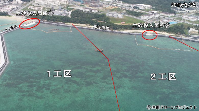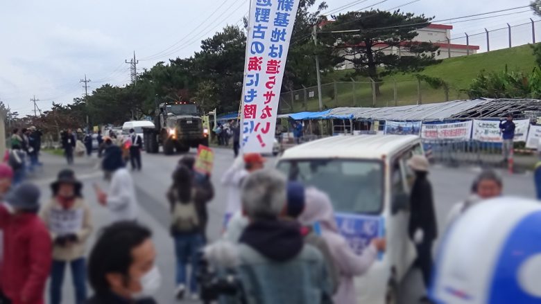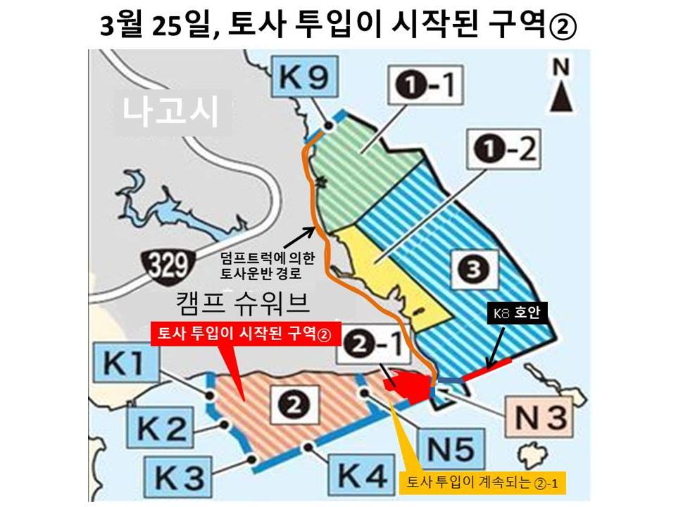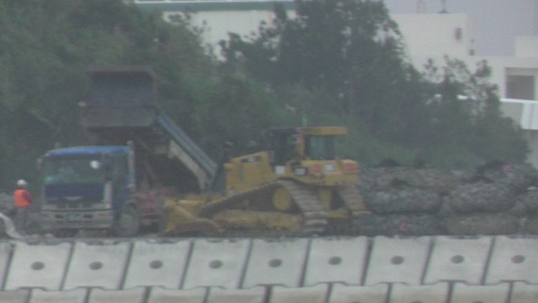오전 9시 30분, 카누 44정, 항의선 9척으로 토사 투입이 시작된 구역 근처에서 플래카드를 내걸고 항의했다. 또한 스피커로 방위국 직원을 향해 “오키나와의 미래는 오키나와가 결정한다” “연약 지반도 활단층도 있다. 부서질 것 같은 기지는 만들지 마라”등을 반복해 외쳤다. 오후, 해변에서 열린 집회가 끝난 후 다시 한 번 현장으로 향했다. 2시간이 지난 후, 해경과 실랑이가 이어졌다. 카누 20정이 펜스를 넘어 구역 내로 진입했지만 바로 진압당했다. 3시쯤 구역②의 두 곳에 토사 투입이 시작됐다. 카누 시위에 참가한 50세의 N씨는 “덤프 트럭이 아무일 없다는 듯 토사를 운반하는 것을 보니 눈물이 났다. 딸을 위해, 다음 세대를 위해서라도 기지 건설 저지 행동에 나설 수밖에 없다.”