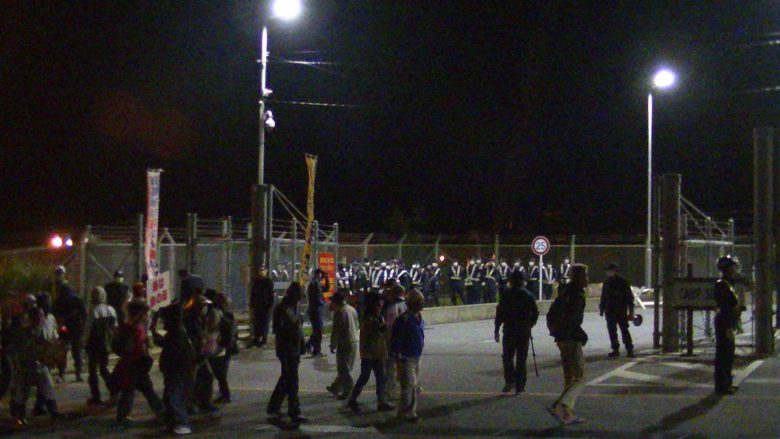 카누팀의 해상 대행동에 맞춰 게이트 앞에서도 이른 5시부터 작업원의 차를 기지 안에 들어가지 못하게 40여 명이 막았다. 기동대도 이를 예상했는지 100명 가까이 대기해 시민을 인도 쪽으로 밀어붙이고 작업원의 차량 100대를 통과시켰다. 항의 시위 중 여성 한 명이 플래카드로 기동대원의 머리를 때린 혐의로 체포되었다. 8시 30분, 350여 명이 “바다를 파괴하지 마라” 등을 외치며 제3게이트까지 행진했다.
