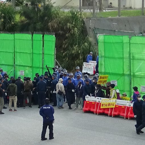 파도가 높아서 운반선이 부두에 접안하지 못하여 덤프트럭의 토사 반입은 없었다. 이런 날도 일년에 어느 정도는 있다. 가끔은 하늘이 우리를 도울 때가 있다. 일열로 늘어서서 라인 댄스를 추면서 다 함께 작업 중지를 기뻐했다. 10시가 지나 캠프 슈워브 앞으로 이동했다. 효고현에서 부모 자녀3명으로 처음으로 오키나와를 찾아 온 여성은 “이웃 사람에게 오키나와 소식을 들었다. 오키나와를 위해서 자기가 할 수 있는 일을 하고 싶다”고 이야기했다.그런데 오후로부터 다시 덤프트럭이 작업을 시작하여 수백 대가 토사를 반입한 것으로 보인다.