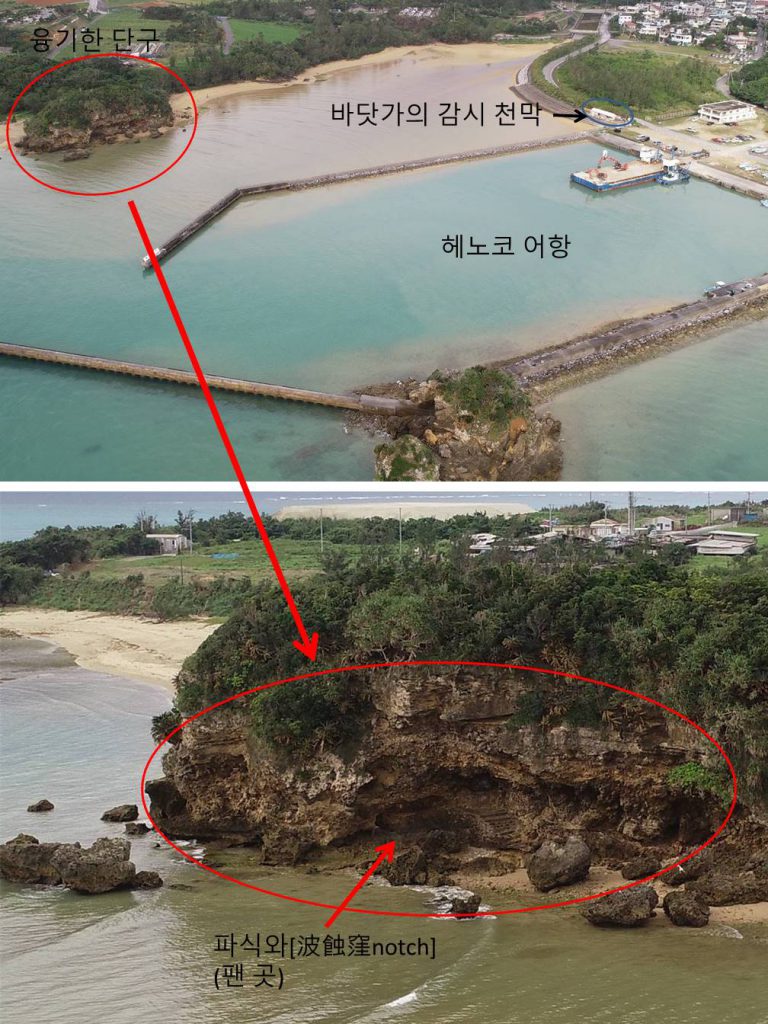 지질학 전문가의 그룹이 전일에 조사한 결과에 의거해, 헤노코 어항 근처에 있는 감시 천막 바로 앞에 활단층의 ‘흔적’이 있다고 발표했다. 전문가들이 바다에 튀어나온 단구 측면에 파도에게 침식된 파식와(波蝕窪notch 팬 곳)를 확인했다. 단구는 헤노코 단층에서 일어난 지진으로 융기한 것이고, 파식와는 단층의 북쪽이 진하하고 남쪽이 융기한 증거라고 지적했다. 타테이시 마사아키(立石雅昭) 니이가타(新潟)대학교 명예교수는 “융기는 1미터 이상이며 지진은 여러 번 발생한 것으로 보인다. 헤노코 단층이 활단층인 가능성이 더욱더 높아졌다” 고 했다. 근간에 다시 조사할 예정이다.