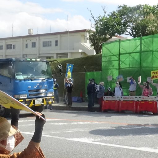 ‘수요 행동’.오키나와 중의원 보궐선거로 야라 도모히로씨가 당선된 이후의 첫 행동일이라,110명 이상의 시민이 모였다.선거에서 또 다시 ‘매립 반대’라는 민의가 명확하게 드러났음에도 불구하고 토사 반입을 계속하는 아베 정권에 대해,”오키나와를 무시하지 말라” “민주주의를 지켜라”라며 입을 모아 소리를 높였다.바나나⋅ 단팥죽 등의 간식이 전달되며 훈훈한 분위기에 싸이기도 한 반면, 시위 대열을 향해 속력을 낮추지 않은 채 돌진해 오는 덤프트럭을, 시민들이 에워 싸며 격렬하게 비난하는 장면도 있었다.